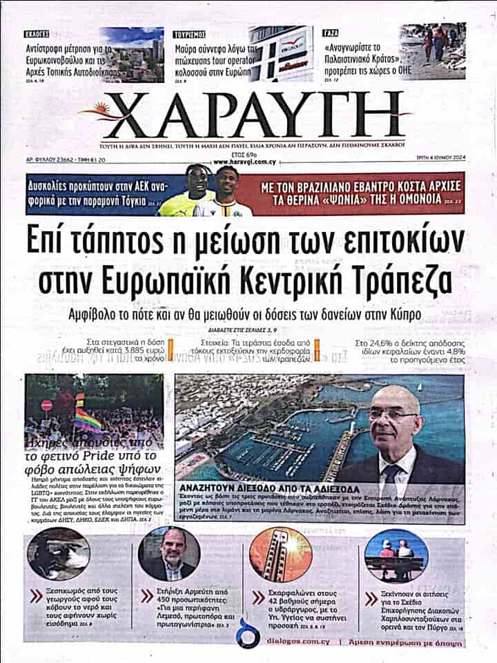 HARAVGİ “Avrupa Merkez Bankası’nda faiz indirimi masada” başlığını kullandığı manşet haberinde Güney Kıbrıs’ta kredilerin taksitlerinin ne zaman düşeceğinin veya düşüp düşmeyeceğinin şüpheli olduğuna değiniyor.