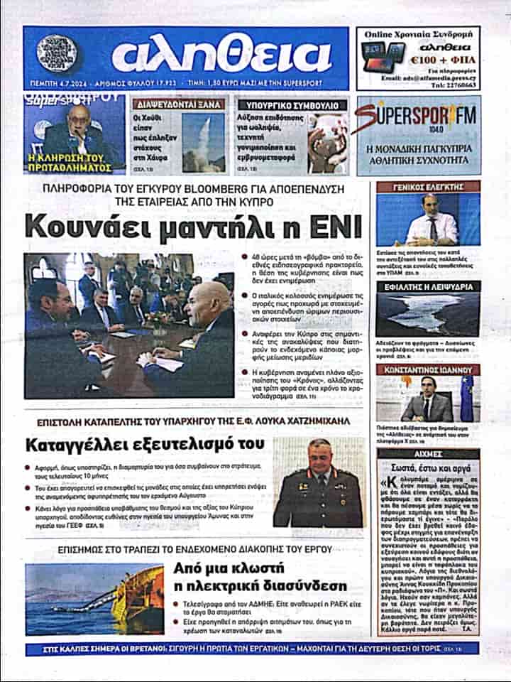 ALİTHİA manşet haberinde, “ENİ mendil sallıyor” başlığını kullandı ve Bloomberg kanalının, İtalyan devi ENİ doğalgaz konsorsiyumunun, piyasaları, varlıklarının elden çıkarılması hedefi ile ilerleyeceği konusunda bilgilendirdiği yönünde bir haber yayınladığını, Rum hükümetinin ise konuya dair bilgisinin olmadığını açıkladığını ve bu gibi bir durumda, Rum hükümetinin takvim sürecini bir yıl içinde üçüncü kez değiştireceğini aktarıyor.