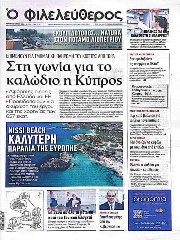 “Nissi Beach Avrupa’nın en iyi plajı” başlıklı bir diğer ön sayfa haberinde Fileleftheros, Ayia Napa’da bulunan Nissi plajının uzmanlardan bir ayrıcalık daha elde ederek Avrupa’nın en iyi plajı olarak gösterildiğini, Malta’nın ikinci, Slovenya’nın üçüncü ve dördüncü sırada ise Girit’teki Elafonisi’nin (Geyik Adası) yer aldığını aktarıyor.