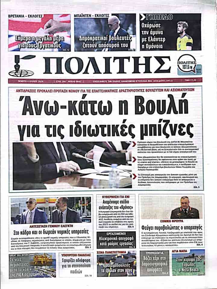 POLİTİS “Özel işlerle ilgili Meclis alt üst” başlığını çektiği bugünkü manşet haberinde, Güney Kıbrıs’ta Anayasa’nın sadece Rum Yönetimi Başkanı’nın ikinci bir iş yapmasını yasakladığını, bakanlar ve müsteşarların ise sadece etik kurallar gereği ikinci iş yapmadıklarını yazdı.