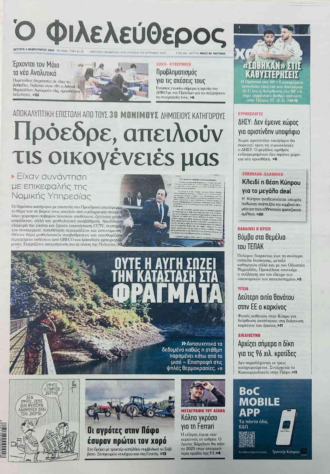 FİLELEFTEROS manşetten aktardığı haberinde “Sayın Başkan, ailelerimizi tehdit ediyorlar” başlığını kullanarak 38 daimi kamu savcısından açıklayıcı mektup geldiğine ve Rum Hukuk Servisi Başkanıyla toplantı yaptıklarına değiniyor.