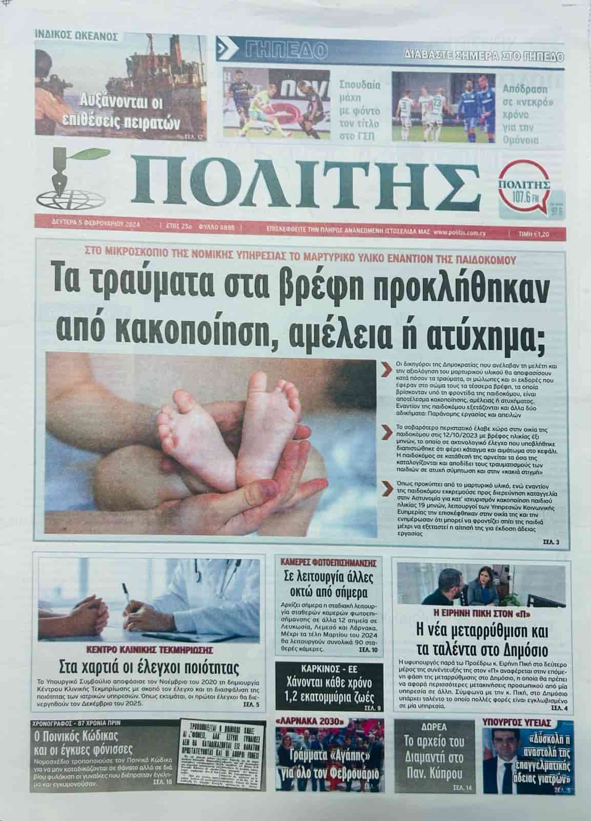 POLİTİS “Bebek yaralanmaları istismar, ihmal veya kazadan mı kaynaklandı?” başlığını kullandığı manşet haberinde Güney Kıbrıs’ta bir çocuk bakıcısının baktığı çocuklara yönelik şiddet olaylarına ilişkin tanık materyallerinin Rum Hukuk Dairesi tarafından mercek altına alındığına değiniyor.