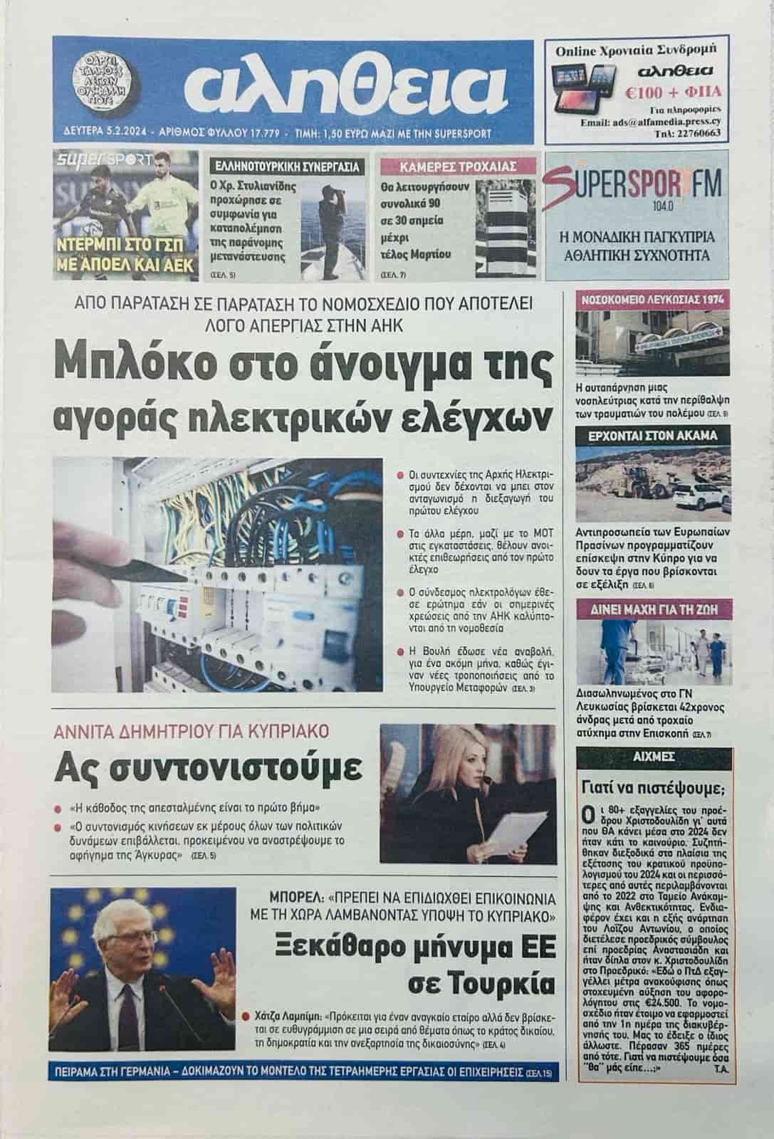 ALİTHİYA “Elektrik kontrolleri pazarının açılmasına engel” başlığı ile aktardığı manşet haberinde Rum Elektrik Kurumu’ndaki grevin, yasa tasarısının sürekli olarak ertelenmesine neden olduğuna değiniyor.