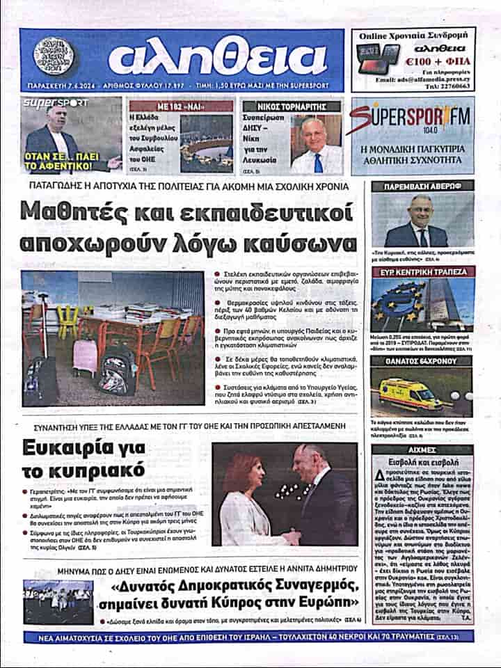 ALİTHİYA “Öğrenciler ve öğretmenler sıcaktan dolayı ayrılıyorlar” başlığı ile aktardığı manşet haberinde Rum hükümetinin bir öğretim yılı başarısızlığının daha olduğuna değiniyor.