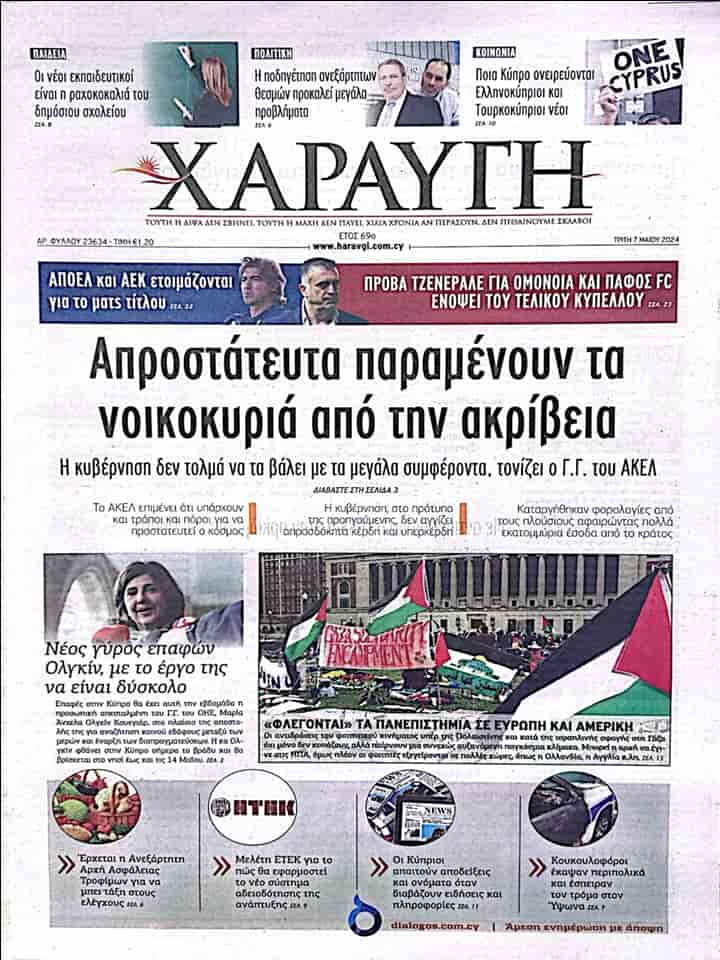 HARAVGİ “Hane halkı pahalılıktan korunmamış kalıyor” başlığını kullandığı manşet haberinde AKEL Genel Sekreteri Stefanos Stefanu’nun yaptığı açıklamada Rum hükümetinin büyük çıkarlarla uğraşmaya cesaret edemediğini vurguladığına değiniyor.