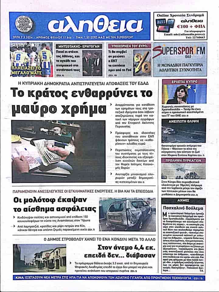 ALİTHİYA gazetesi, manşetten paylaştığı haberinde “Devlet kara parayı teşvik ediyor” başlığını kullanarak Güney Kıbrıs hükümetinin Avrupa İnsan Hakları Mahkemesinin kararlarına karşı çıktığına değiniyor.