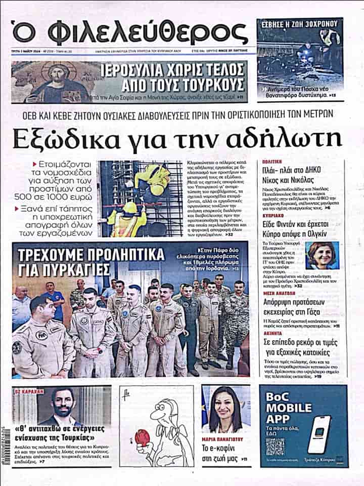 FİLELEFTEROS “Kayıt dışı çalışanlara protesto” başlığı ile aktardığı manşet haberinde Güney Kıbrıs İşverenler ve Sanayiciler Federasyonu ve Güney Kıbrıs Ticaret ve Sanayi Odası’nın önlemlerin belirlenmesinden önce detaylı istişareler talep ettiklerine, cezaların 500 eurodan bin euroya çıkarılması için yasa tasarısı hazırlandığına ve tüm çalışanların zorunlu dijital envanterinin/sayımının yeniden masaya yatırıldığına değiniyor.