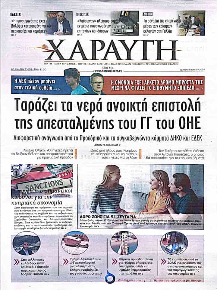 HARAVGİ “BM Genel Sekreteri’nin Kişisel Temsilcisi’nin açık mektubu ortalığı karıştırıyor/suları bulandırıyor” başlığını kullandığı manşet haberinde Rum Başkanlık Sarayı ve eş iktidar partileri DİKO ve EDEK’ten farklı okumalar olduğuna değiniyor.