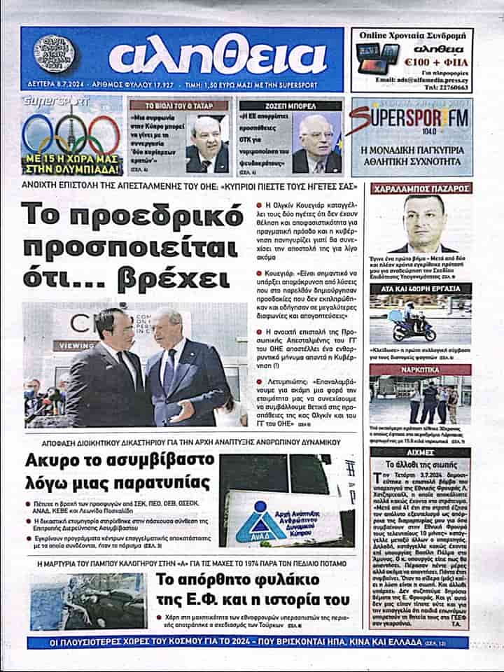 ALİTHİYA manşetten paylaştığı haberinde “Rum Başkanlık Sarayı ilerliyormuş gibi davranıyor” başlığını kullanarak BM Genel Sekreteri’nin Kişisel Temsilcisi Maria Angela Holguin Cuellar’ın ‘Kıbrıslılar liderlerinize baskı yapın’ şeklinde açık mektup gönderdiğine değiniyor.