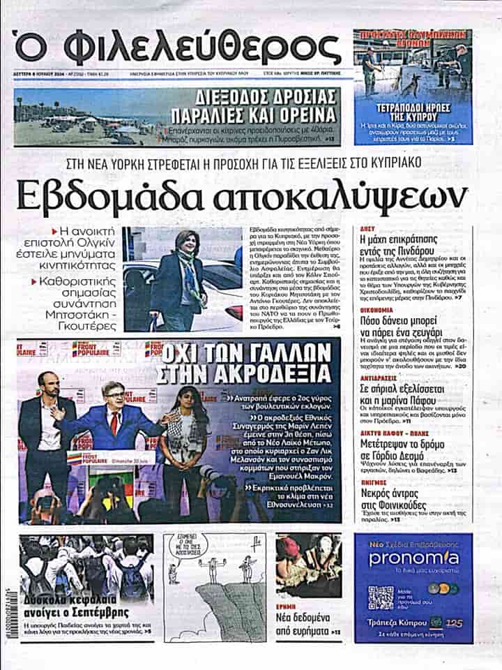 FİLELEFTEROS “Açıklamalar haftası” başlığı ile aktardığı manşet haberinde Kıbrıs Sorunu konusundaki gelişmelerde dikkatlerin New York’a çevrildiğine, Holguin’in mektubunun hareketlilik mesajları gönderdiğine ve Mitsçotakis-Guterres görüşmesinin belirleyici bir öneme sahip olduğuna değiniyor.