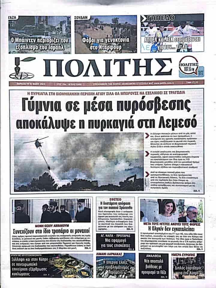POLİTİS manşetten aktardığı haberinde “Limasol’daki yangın, itfaiyenin müdahale etmede yetersiz kaldığını ortaya çıkardı” başlığını kullanarak Limasol’da Ayios Silas köyünde bulunan sanayi bölgesinde çıkan yangının bir trajediye dönüşebileceğine değiniyor.