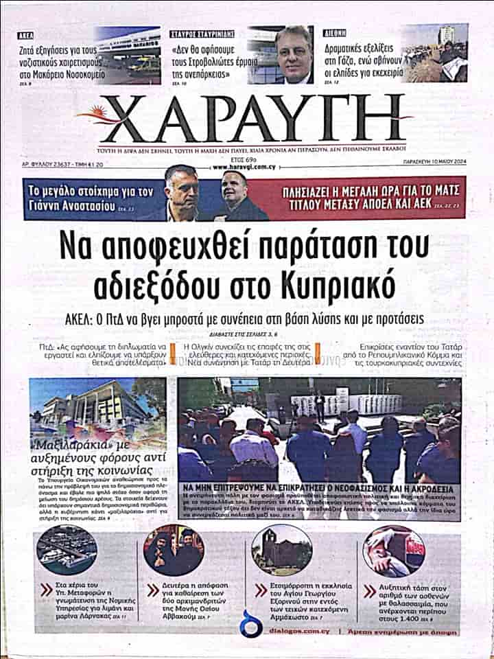 HARAVGİ “Kıbrıs Sorunu’ndaki çıkmazın daha da uzamasını önlemek için” başlığını kullandığı manşet haberinde AKEL’in yaptığı açıklamada Rum Lider Nikos Hristodulidis’in tutarlı bir şekilde çözüm temelinde ve önerilerle öne çıkması gerektiğini söylediğine değiniyor.
