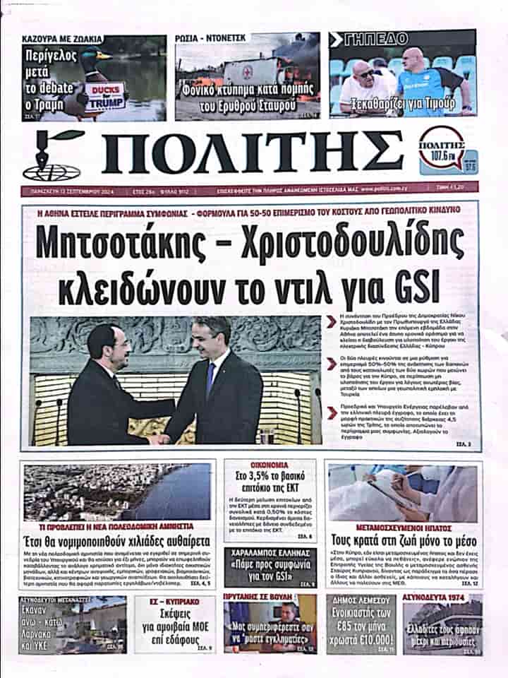 POLİTİS manşetten aktardığı haberinde “Mitsçotakis ve Hristodulidis Büyük Deniz Bağlantısı projesi için anlaşmayı yaptılar” başlığını kullanarak Atina’nın, jeopolitik riskin maliyetinin yarı yarıya paylaşılmasına yönelik formül anlaşmasının ana hatlarını gönderdiğine değiniyor.