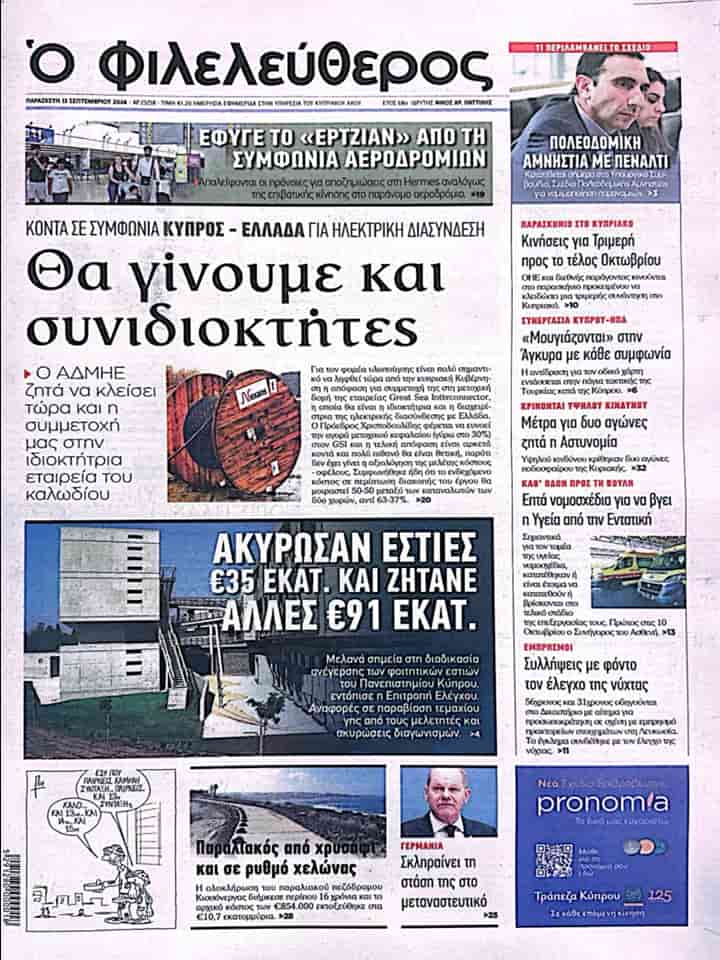 FİLELEFTEROS “Biz de ortak sahibi olacağız” başlığı ile aktardığı manşet haberinde Güney Kıbrıs ve Yunanistan’ın kablo ile elektrik bağlantısı için anlaşmaya yakın olduklarına değiniyor.
