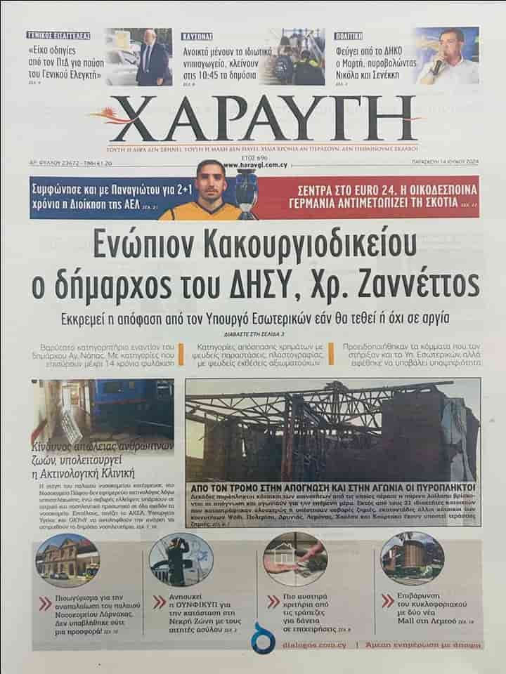 HARAVGİ “DİSİ’li Ayia Napa Belediye Başkanı Hristos Zannetos Ağır Ceza Mahkemesi huzurunda” başlığını kullandığı manşet haberinde Rum İçişleri Bakanı’nın, Zannetos’un görevden alınıp alınmayacağına ilişkin kararının beklendiğine değiniyor.