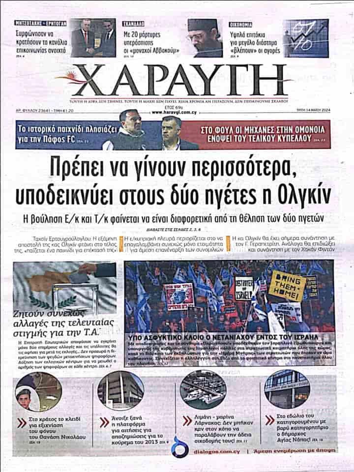 HARAVGİ manşetten aktardığı haberinde “Holguin iki lidere, daha fazlasının yapılması gerektiğine dikkat çekti” başlığını kullanarak Kıbrıslı Türkler ve Rumların iradesinin iki liderin isteğinden farklı olduğunun göründüğüne değiniyor.