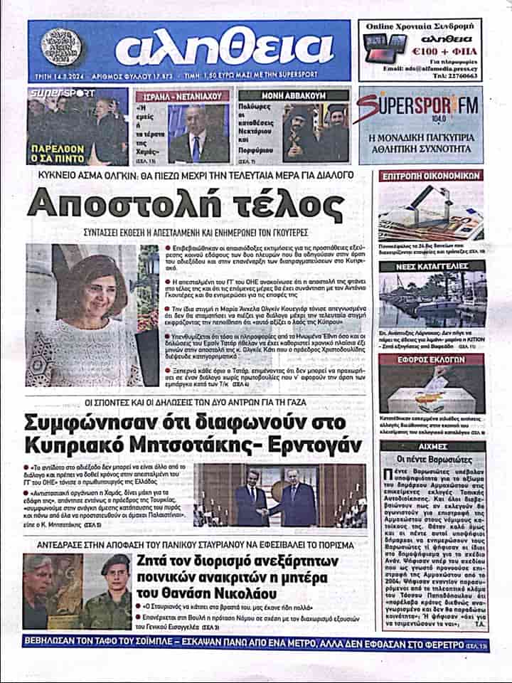 Gazete ön sayfadan aktardığı başka bir haberde “Erdoğan ve Miçotakis Kıbrıs Sorunu’nda anlaşamadıkları konusunda anlaştılar” başlığını kullanarak Yunanistan Başbakanı Kiryakos Miçotakis’in yaptığı açıklamada çıkmazın panzehirinin ancak diyalog olabileceğini ve BM Genel Sekreteri’nin Kişisel Temsilcisi’ne zaman tanınması gerektiğini söylediğine, TC Cumhurbaşkanı Recep Tayyip Erdoğan’ın yaptığı açıklamada ise Hamas’ın kendi toprakları için savaşan bir direniş örgütü olduğunu söylediğine ve Miçotakis’in de derhal ateşkesin sağlanması ve her şeyden önce Filistinli sivillerin korunması gerektiği konusunda Erdoğan ile hemfikir olduklarını söylediğine değiniyor.