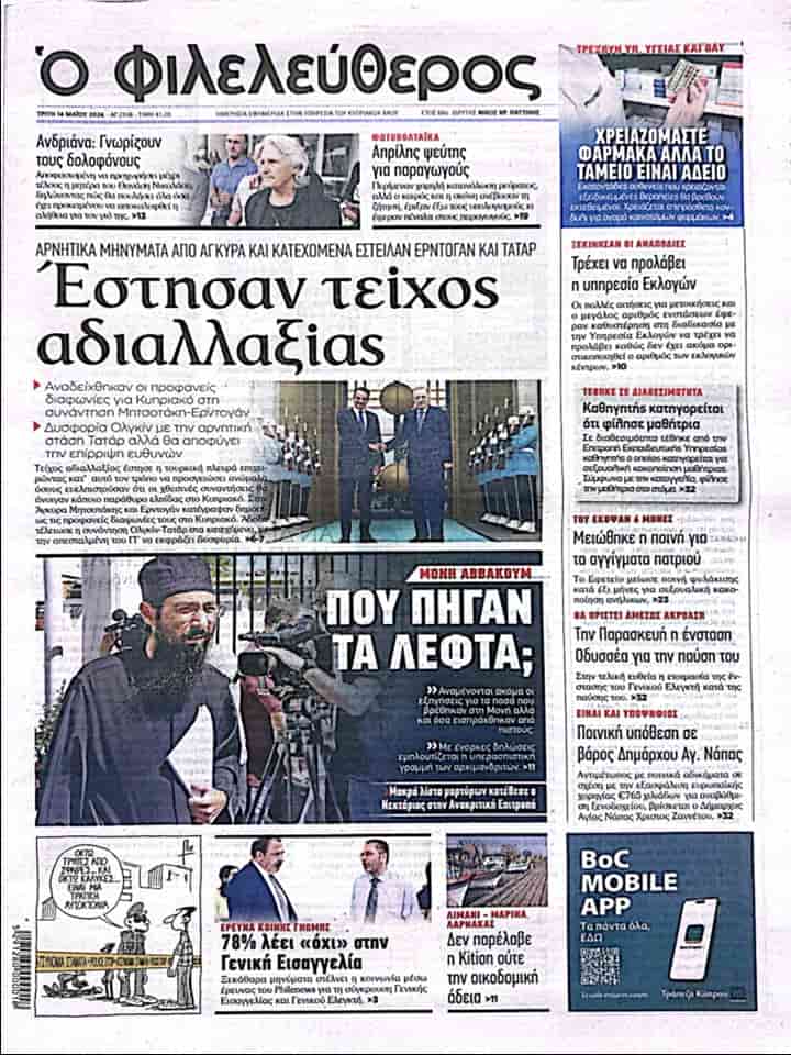 FİLELEFTEROS manşetten paylaştığı haberinde “Uzlaşmazlık duvarı örüyorlar” başlığını kullanarak Ankara’dan ve KKTC’den TC Cumhurbaşkanı Recep Tayyip Erdoğan ve Cumhurbaşkanı Ersin Tatar’dan sözde olumsuz mesajlar geldiğine, dün gerçekleştirilen Erdoğan- Miçotakis görüşmesinde Kıbrıs Sorunu konusunda görüş ayrılıklarının bariz bir şekilde görüldüğüne ve BM Genel Sekreteri’nin Kişisel Temsilcisi Maria Angela Holguin Cuellar’ın Cumhurbaşkanı Ersin Tatar’ın sözde olumsuz tavrından rahatsızlık duyduğuna ancak sorumluluk yüklemekten kaçındığına değiniyor.