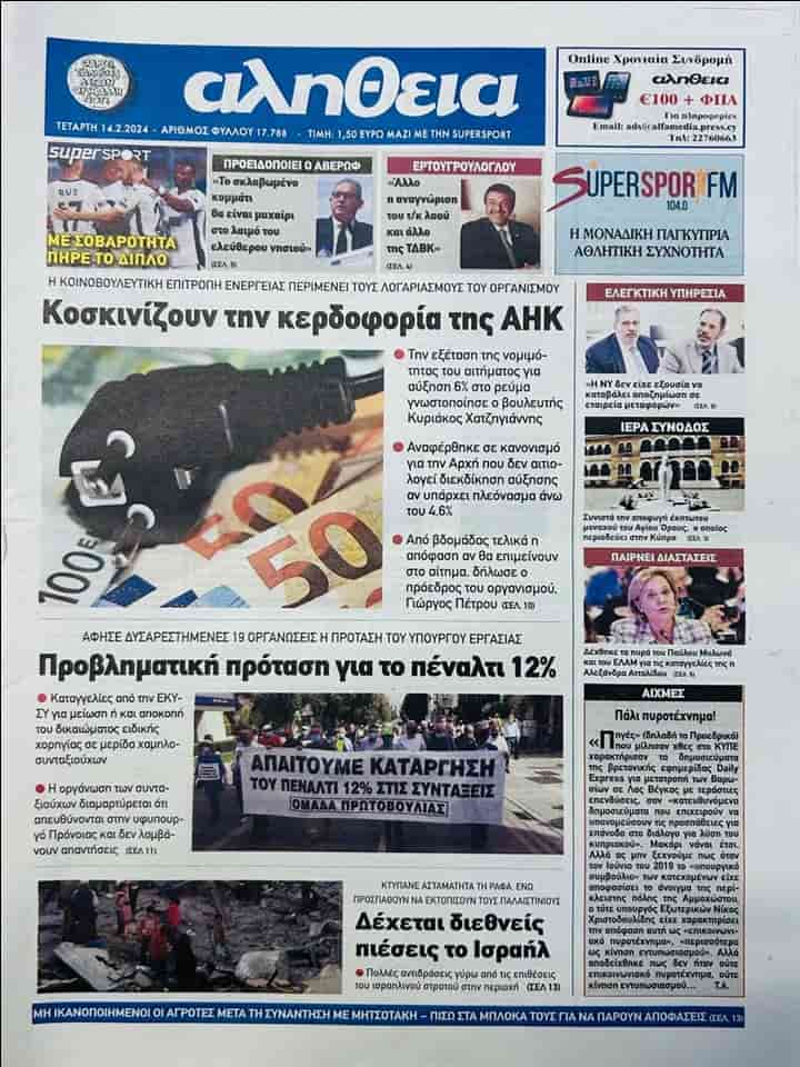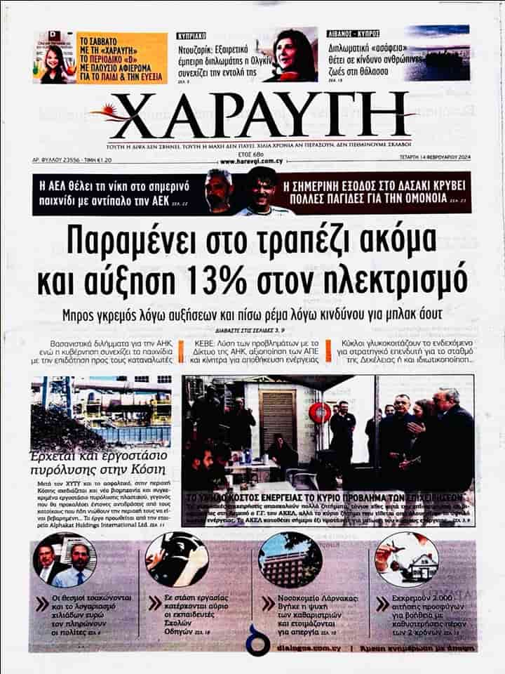 ALİTHİA manşetten aktardığı haberinde, “Rum Elektrik İdaresi’nin kârlılığı elekten geçiriliyor” başlığını kullandı ve Meclis Enerji Komitesi’nin faturaları görmeyi beklediğini yazarak, milletvekili Kiriyakos Hacıyannis’in, elektriğe %6 oranında zam yapılması talebinin yasallığının inceleneceğini açıkladığını aktarıyor.