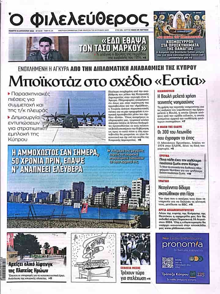 FİLELEFTEROS manşetten aktardığı haberinde “Estia planına boykot” başlığını kullanarak Ankara’nın, Güney Kıbrıs’ın diplomatik yükselişinden sözde rahatsız olduğuna, Kıbrıs Türk tarafının da plana katılımı yönünde perde arkasında baskıların olduğuna ve Güney Kıbrıs’ın askeri katılımına ilişkin izlenimler yaratılmak istendiğine değiniyor.