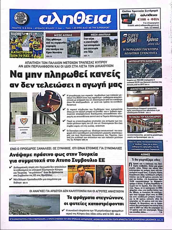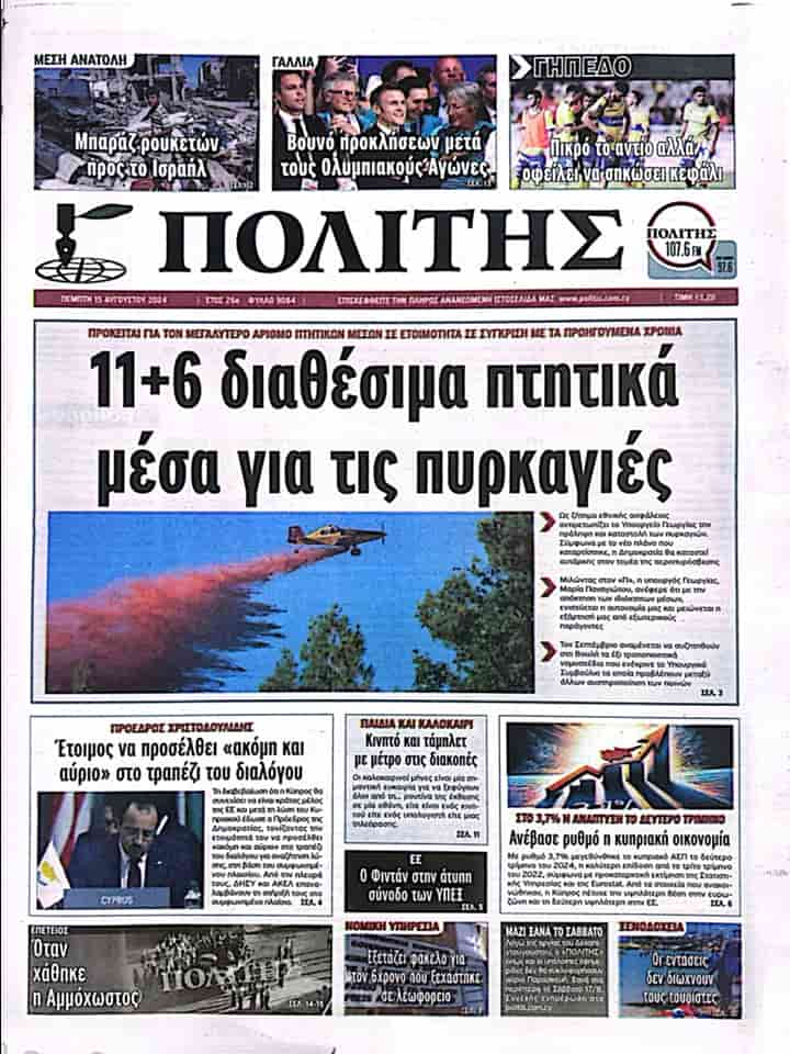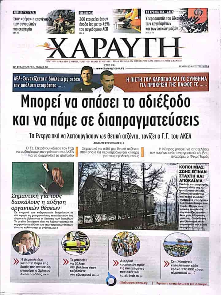 15 Ağustos 2024 Güney Kıbrıs Gazete Manşetleri