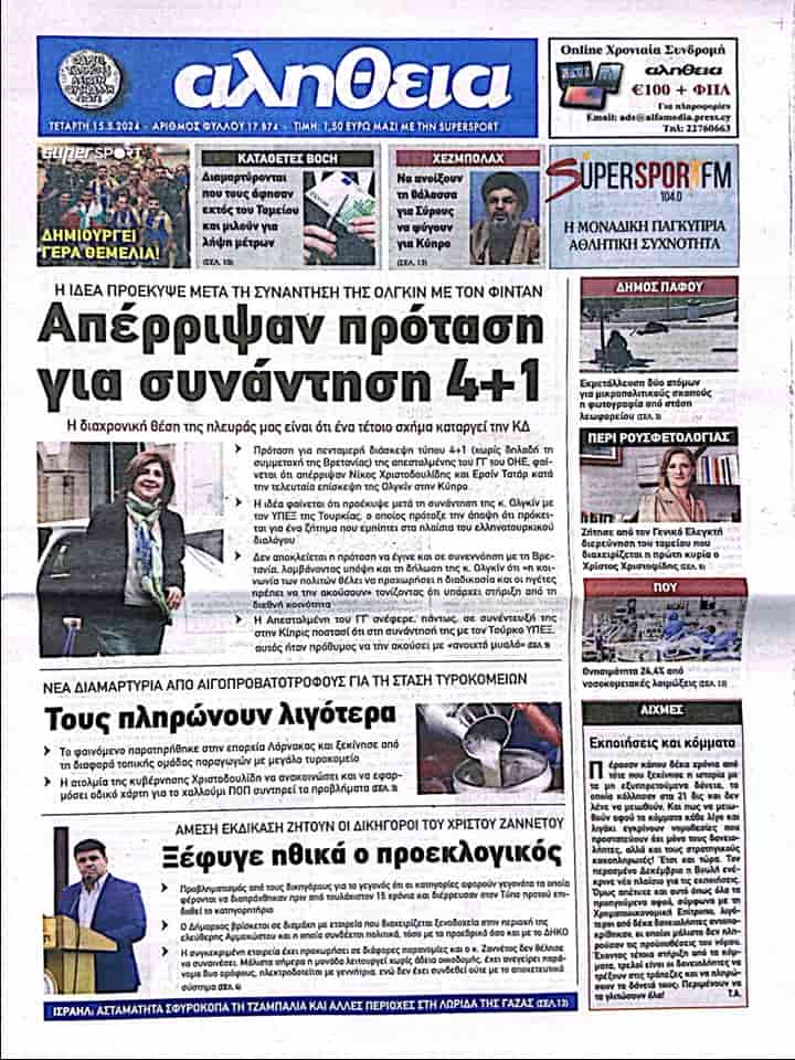 ALİTHİYA manşetten aktardığı haberinde “4+1 toplantı teklifini reddettiler” başlığını kullanarak bu fikrin BM Genel Sefreteri’nin Kişisel Temsilcisi Maria Angela Holguin Cuellar’ın Türkiye Dışişleri Bakanı Hakan Fidan ile görüşmesinden sonra ortaya çıkıtığına ve Güney Kıbrıs’ın daimi tutumunun, böyle bir planın Güney Kıbrıs Rum Yönetimini ortadan kaldırmaktan/devre dışı bırakmaktan yana olduğuna değiniyor.
