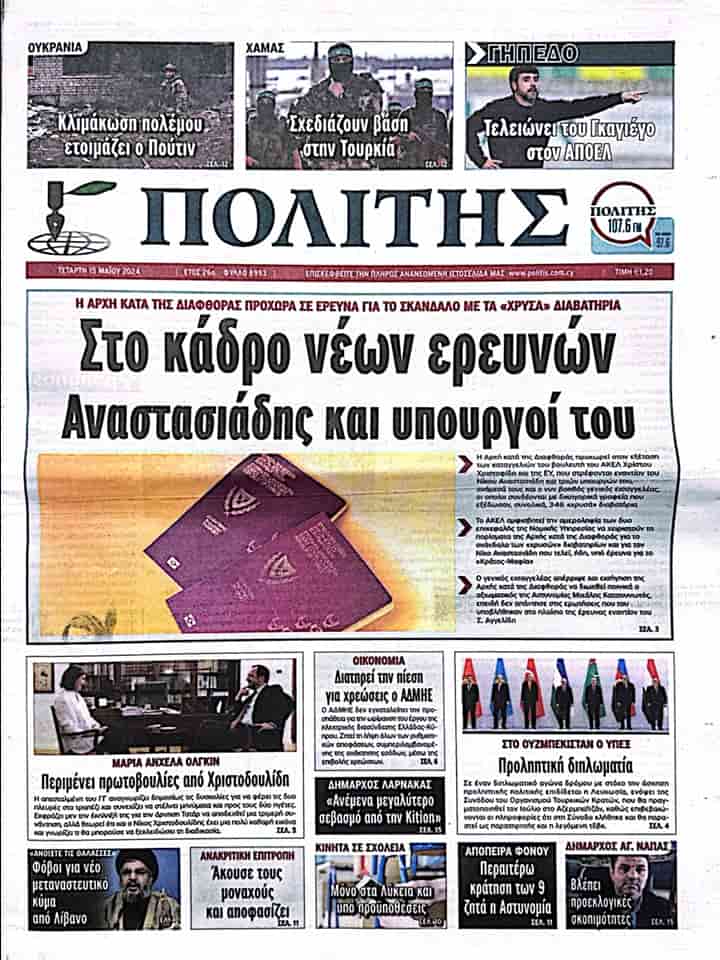 POLİTİS “Anastasiadis ve bakanları yeni soruşturmalar çerçevesinde” başlığını kullandığı manşet haberinde Rum Yolsuzlukla Mücadele Kurumu’nun “Altın Pasaportlar” skandalına ilişkin soruşturmalarına devam ettiğine değiniyor.