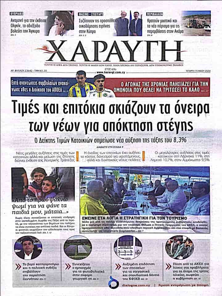 HARAVGİ manşetten paylaştığı haberinde “Fiyatlar ve faiz oranları, gençlerin ev sahibi olma hayellerine gölge düşürüyor” başlığını kullanarak Güney Kıbrıs’ta Konut Fiyat Endeksi’nin %8,3’lük yeni bir artış kaydettiğine değiniyor.