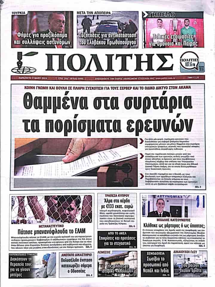 POLİTİS manşetten aktardığı haberinde “Çekmecelerde saklı/gömülü araştırma bulguları” başlığını kullanarak kamuoyunun ve Rum meclisinin Akama bölgesi ile ilgili sunucuları ve yol ağını örtbas etme çabasında olduğuna değiniyor.