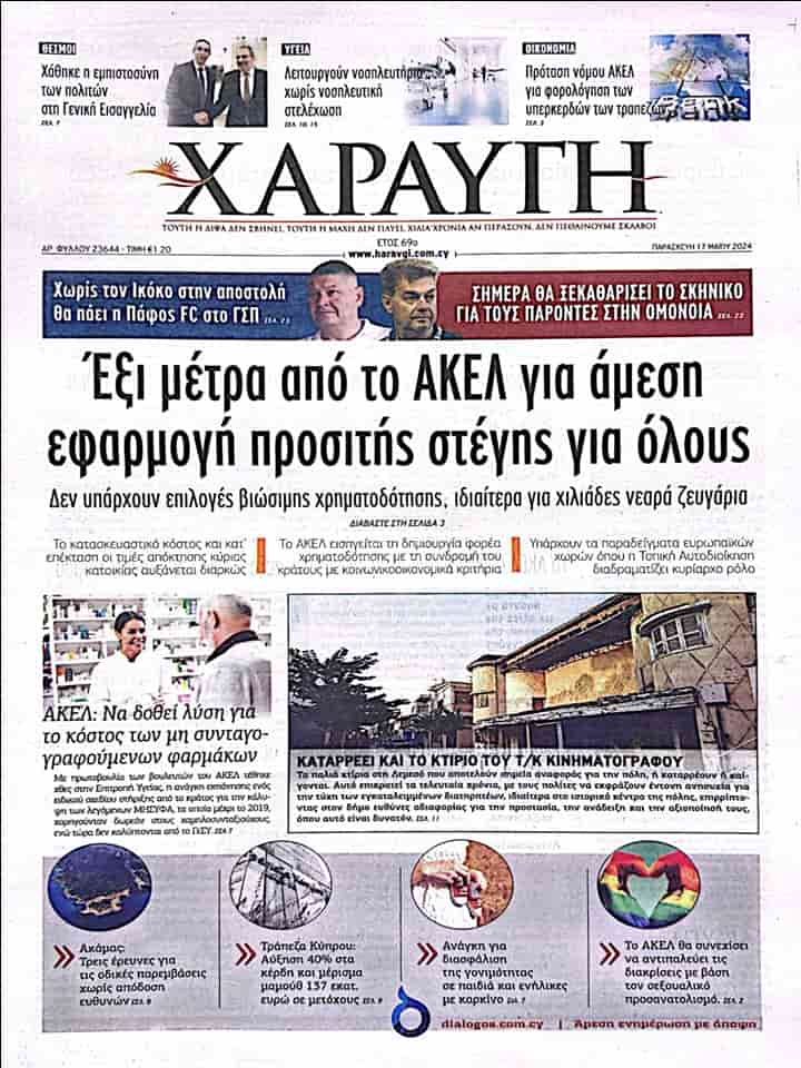HARAVGIİ “Herkese uygun fiyatlı konutların acilen hayata geçirilmesi için AKEL’den altı önlem” başlığını kullandığı manşet haberinde özellikle binlerce genç çift için geçerli sürdürülebilir bir finansman seçeneği olmadığına değiniyor. Haberin detaylarında Güney Kıbrıs’ta inşaat maliyetlerinin ve buna bağlı olarak ana konut edinme fiyatlarının sürekli arttığı, AKEL’in, sosyo-ekonomik kriterlere göre devlet destekli bir finansman organı oluşturulmasını önerdiği ve yerel yönetimlerin baskın rol oynadığı Avrupa ülkeleri örneklerinin olduğu aktarılıyor.