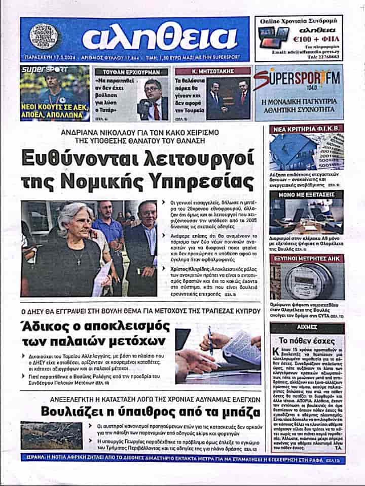ALİTHİYA manşetten paylşatığı haberinde “Hukuk Servisi yetkilileri sorumludur” başlığını kullanarak 2005 yılında öldürülen Rum askeri Thanassis Nikolaos’un annesi Andriana Nikolau’nun yaptığı açıklamada oğlunun ölüm davasının kötü/yanlış yönetildiğini söylediğine değiniyor.
