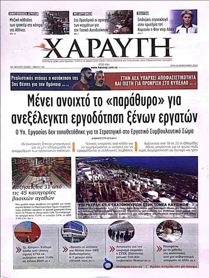 HARAVGİ manşetten aktardığı haberinde “Yabancı işçilerin kontrolsüz istihdamına ilişkin pencere açık duruyor” başlığını kullanarak Rum Çalışma Bakanı’nın, İşçi/İş gücü Danışma Kurulu’ndaki strateji için yetiştirilmediğine değiniyor.