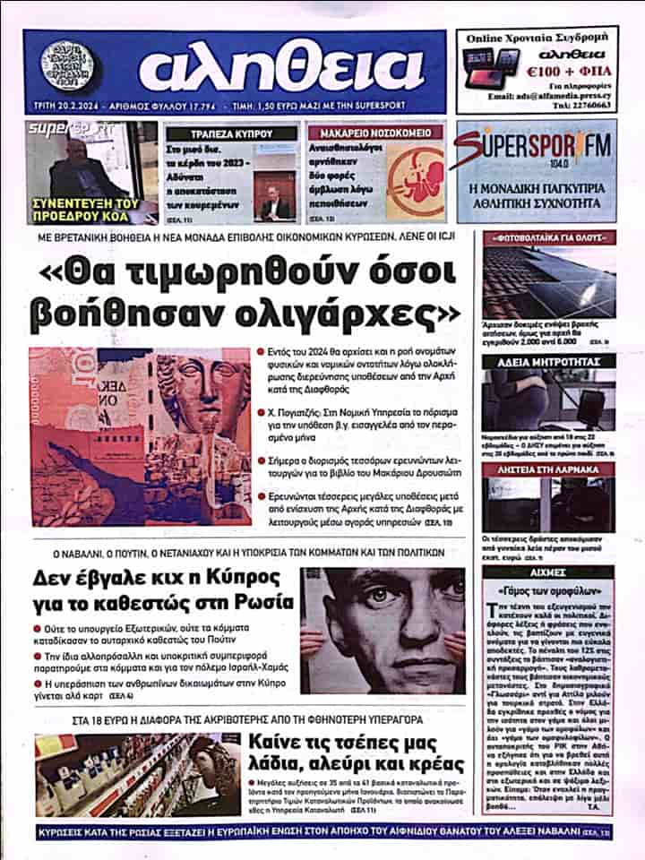 20 Şubat 2024 Güney Kıbrıs Gazete Manşetleri