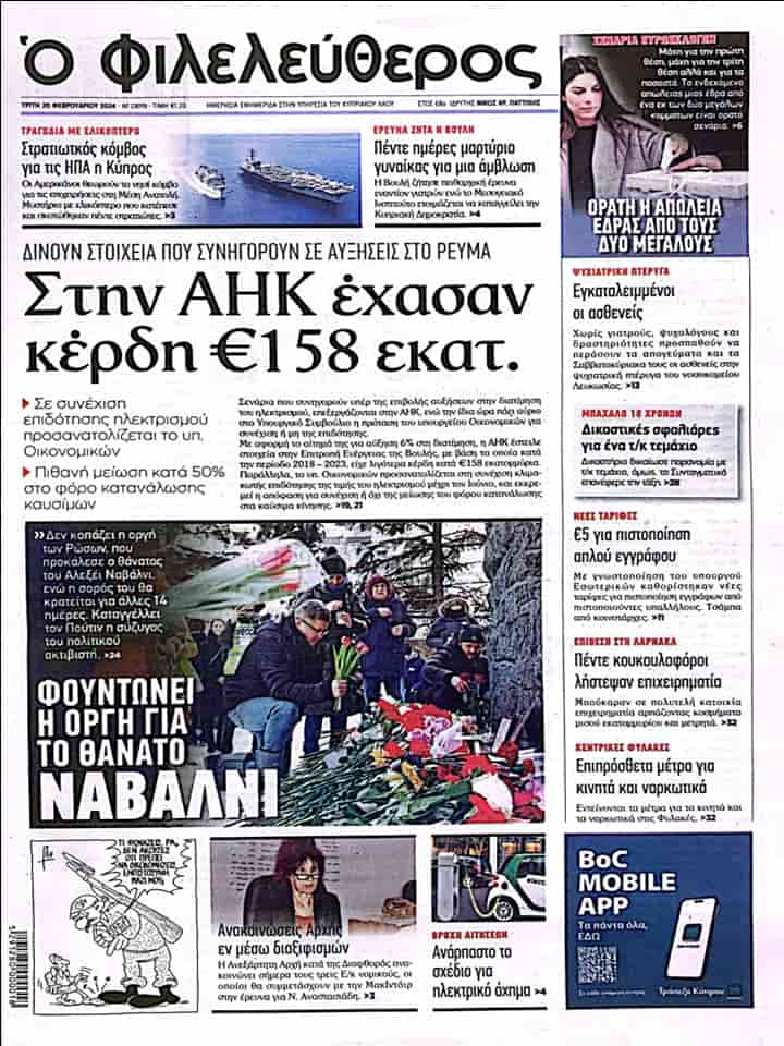 FİLELEFTEROS manşetten paylaştığı haberinde “Rum Elektrik Kurumu 158 milyon euro kâr kaybetti” başlığını kullanarak akımın arttığını gösteren deliller sunduklarına, Rum Maliye Bakanlığı’nın elektrik sübvansiyonunun devamını hedeflediğine ve akaryakıt vergisinde %50 indirimin mümkün olduğuna değiniyor.