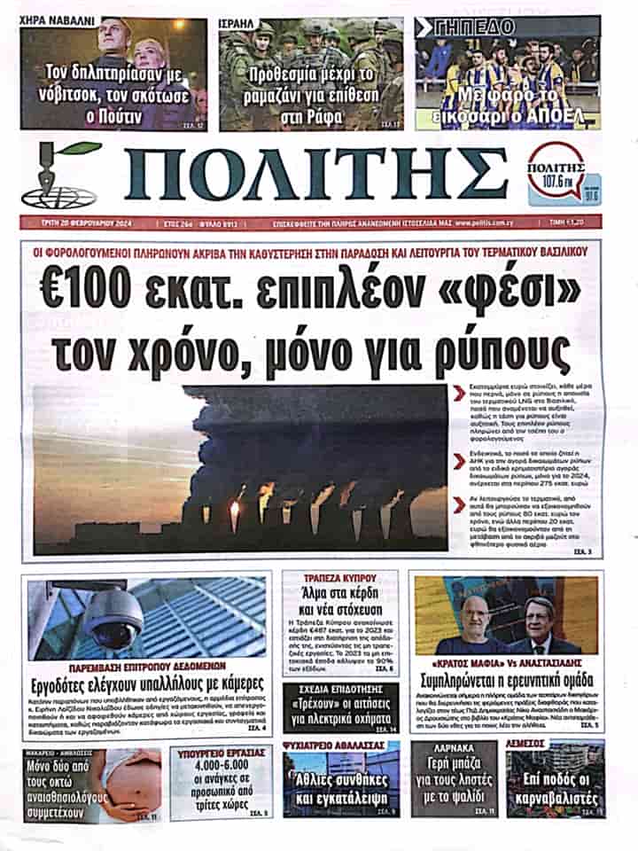 POLİTİS “Sadece kirleticiler için yılda 100 milyon euro ekstra ödenmemiş borç” başlığı ile aktardığı manşet haberinde Vasiliko’daki doğal gaz terminalinin teslimi ve işletmesindeki gecikmenin vergi mükelleflerine pahalıya patladığına değiniyor.