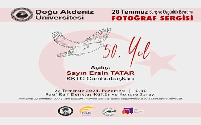 Doğu Akdeniz Üniversitesi (DAÜ) Rektörlüğü himayelerinde, DAÜ Atatürk Araştırma ve Uygulama Merkezi (DAÜ-ATAUM) ile DAÜ İletişim Fakültesi iş birliğinde, Türk Ajansı Kıbrıs (TAK) ve Enformasyon Dairesi katkılarıyla 20 Temmuz Barış ve Özgürlük Bayramı Fotoğraf Sergisi yarın açılıyor.