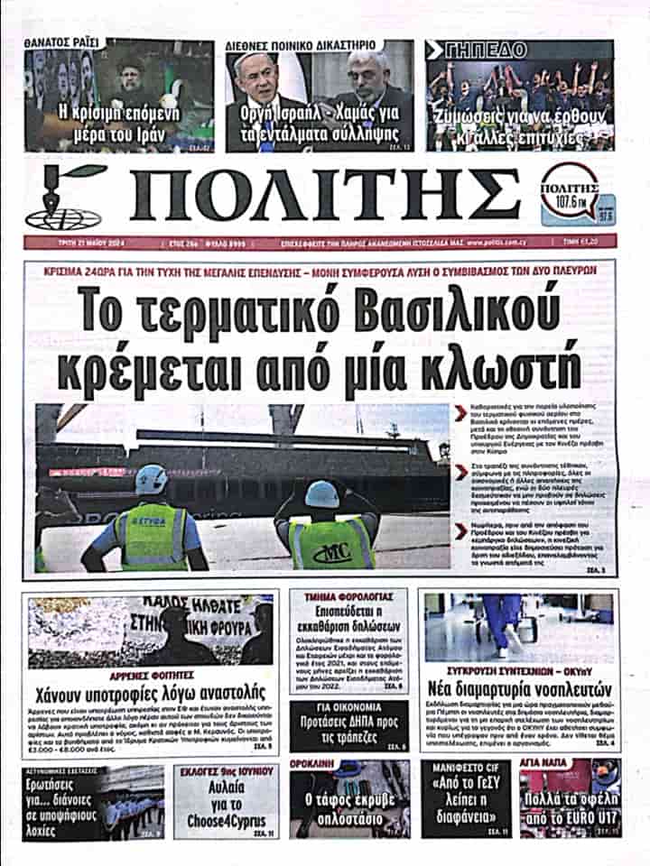 POLİTİS manşetten paylaştığı haberinde “Vasilikos terminali pamuk ipliğine bağlı” başlığını kullanarak büyük yatırım şansı için 24 saatlik kritik bir zaman diliminin olduğuna ve iki taraf arasında uzlaşmanın en uygun çözüm olduğuna değiniyor.