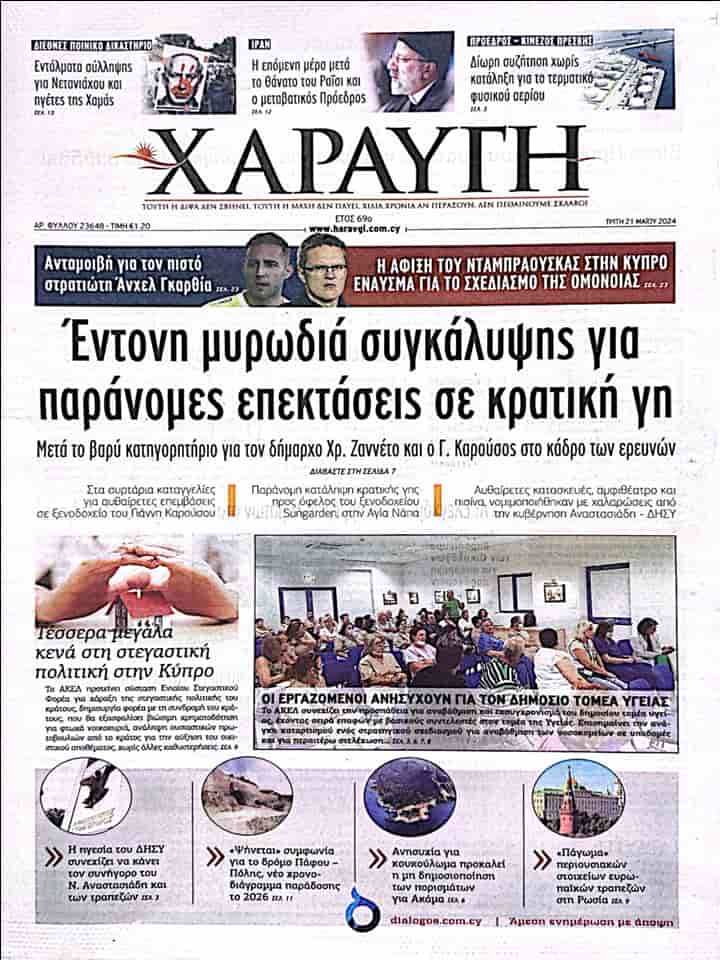HARAVGİ “Hükümet arazilerindeki yasa dışı genişletmelerin örtbas edilmesi yönünde güçlü bir koku yayılıyor” başlığı ile aktardığı manşet haberinde Ayia Napa Belediye Başkanı Hristos Zannetos’un ağır suçlamalarının ardından eski Rum Bayındırlık ve Ulaştırma Bakanı ve eski Ayia Napa Belediye Başkanı Yannis Karusos’un da araştırma listelerinde olduğuna değiniyor.