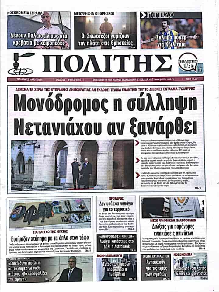 POLİTİS “Eğer tekrar gelirse, tek yol Netanyahu’nun yakalanmasıdır” başlığını kullandığı manşet haberinde Netanyahu hakkında uluslararası bir yakalama kararı çıkarılması halinde Güney Kıbrıs’ın ellerinin bağlı olduğuna değiniyor.