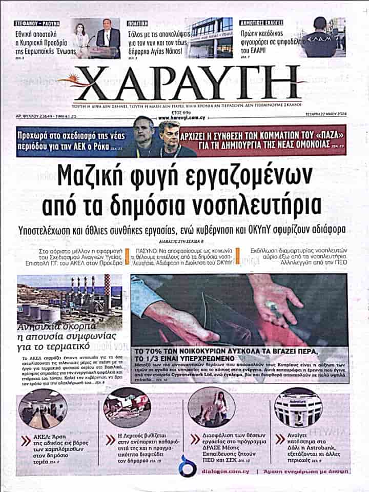 HARAVGİ manşetten paylaştığı haberinde “Kamu sağlık merkezlerinden/hastanelerinden toplu işçi kaçışı” başlığını kullanarak yetersiz personel ve sefil çalışma koşulları varken, Rum hükümetinin ve Rum Kamu Sağlık Hizmetleri Örgütü’nün buna kayıtsız kaldığına değiniyor.