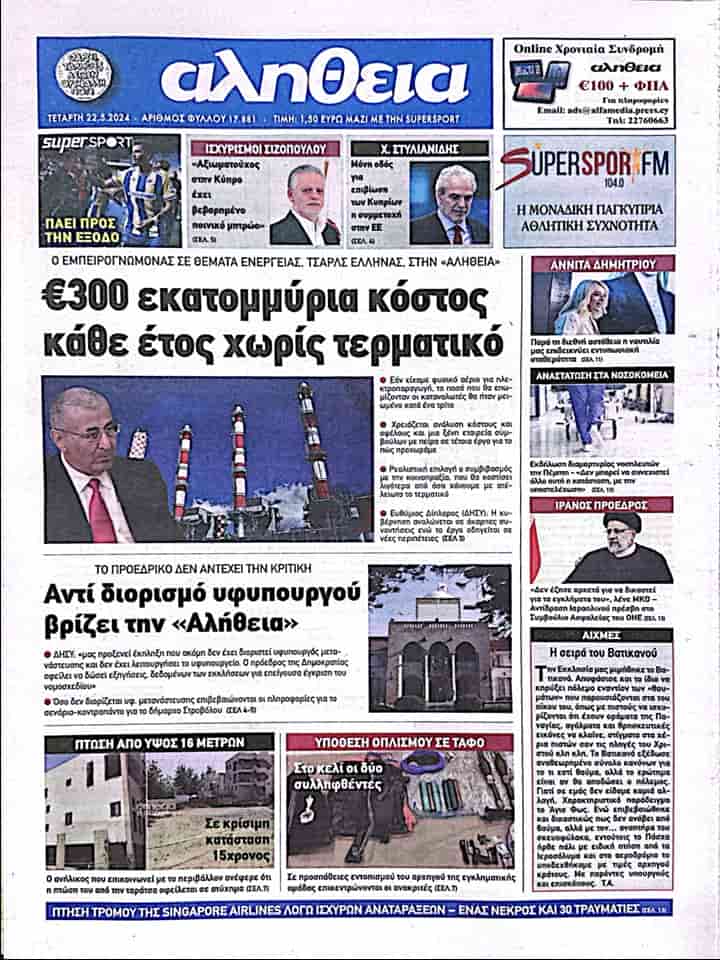 ALİTHİYA “Terminal olmadan her yıl 300 milyon euro maliyet” başlığı ile aktardığı manşet haberinde enerji konuları uzmanı Çarls Ellinas’ın röportajına değiniyor.
