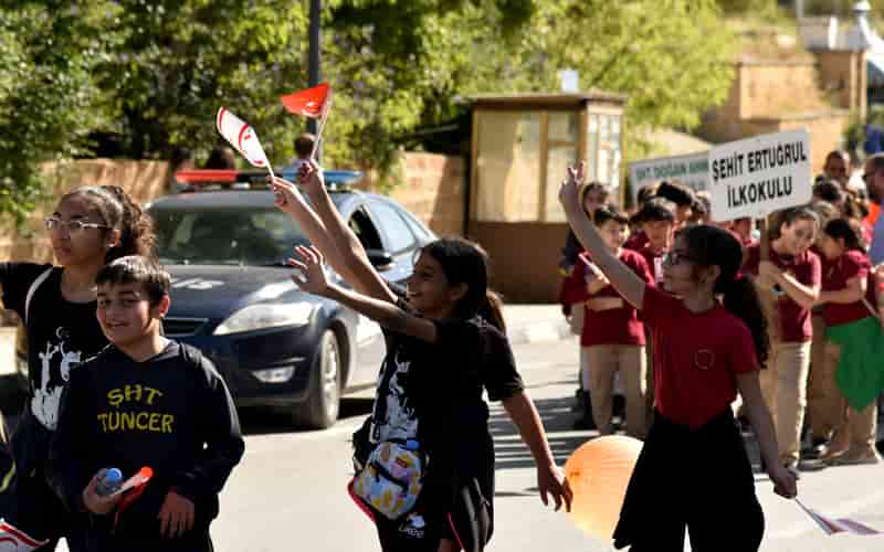Ardından Bakan Çavuşoğlu, öğrenci ve öğretmenlerle kortej halinde Cumhurbaşkanlığı’na yürüdü. Korteje, Lefkoşa Türk Belediyesi Gezi Treni de eşlik etti.