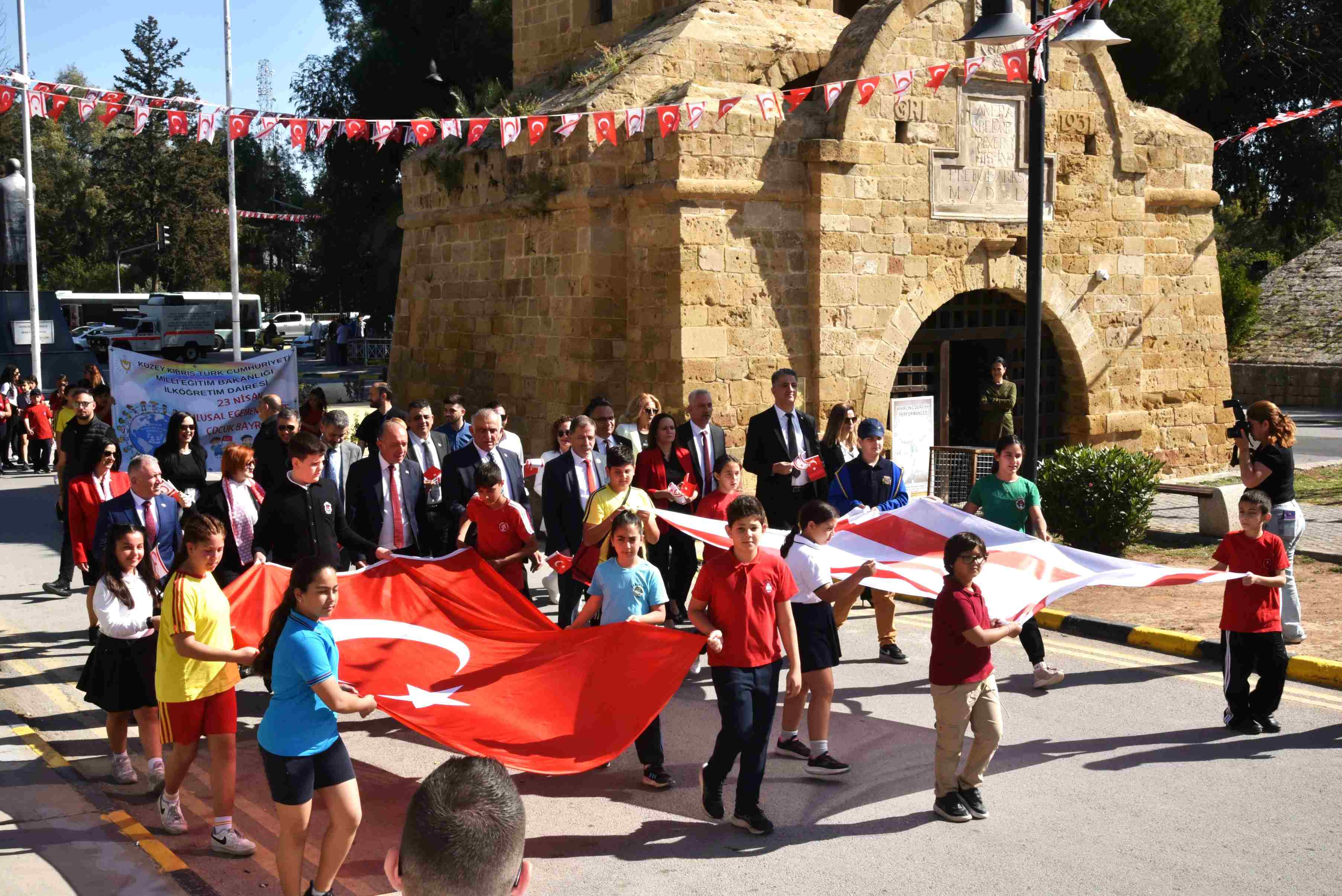 Lefkoşa bölgesinde yer alan ilkokul öğrencilerinin katılımıyla düzenlenen kortej yürüyüşü, Atatürk Anıtı, Cumhurbaşkanlığı ve Cumhuriyet Meclisi güzergahında gerçekleştirildi. Güvenlik Kuvvetleri Komutanlığı Bandosu’nun eşlik ettiği yürüyüşe, Milli Eğitim Bakanı Nazım Çavuşoğlu, Bakanlık bürokratları ve öğretmenler de katıldı.