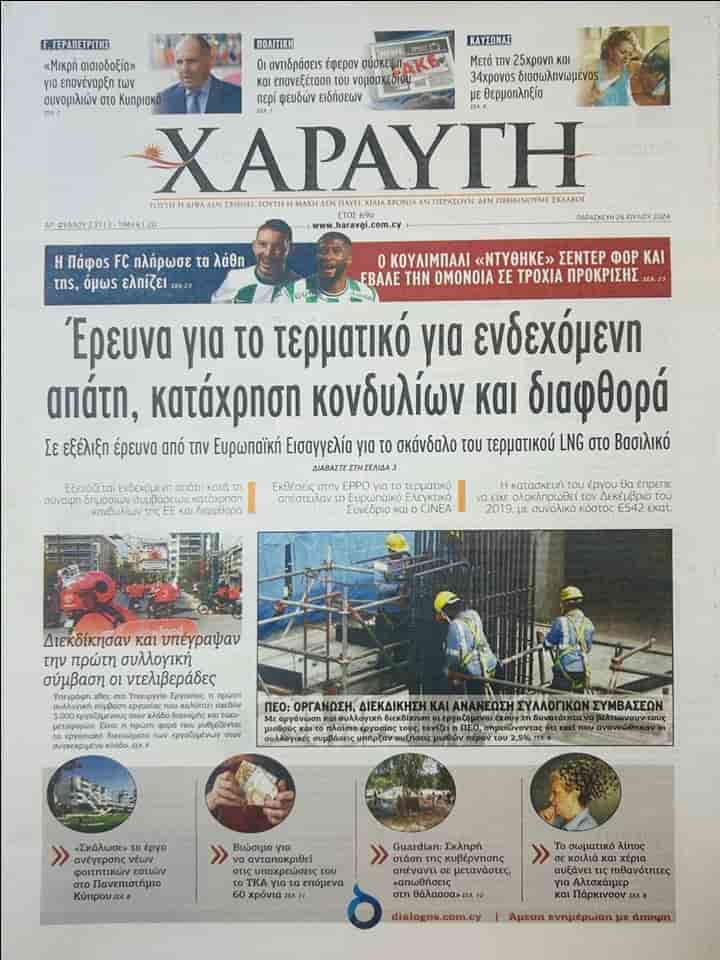 HARAVGİ “Terminalin olası dolandırıcılık, fonların kötüye kullanılması ve yolsuzluk açısından soruşturulması” başlığını kullandığı manşet haberinde Avrupa Başsavcılığı’nın Güney Kıbrıs’ta Vasilikos bölgesinde bulunan doğal gaz santrali skandalı ile ilgili araştırmasının sürdüğüne değiniyor.