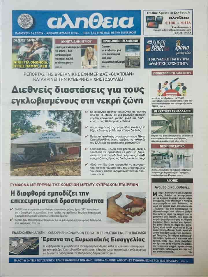 ALİTHİYA manşetten paylaştığı haberinde “Tutukluların ara bölgedeki uluslararası boyutları” başlığını kullanarak İngiliz gazetesi Guardian’in ropörtajının Rum Lider Nikos Hristodulidis hükümetini kötülediğine değiniyor.