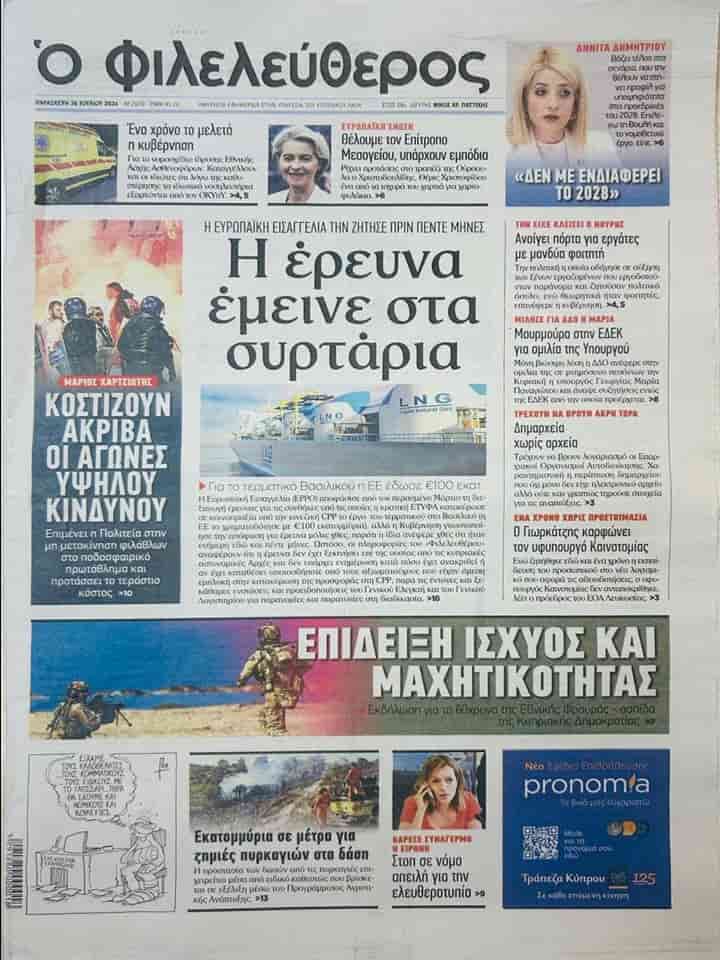 FİLELEFTEROS “Araştırma çekmecede kaldı” başlığı ile aktardığı manşet haberinde AB’nin Güney Kıbrıs’taki Vasilikos doğal gaz teminali için 100 milyon euro ödediğine ve Avrupa Başsavcılığı’nın bu araştırmanın yapılmasını beş ay önce istediğine değiniyor.