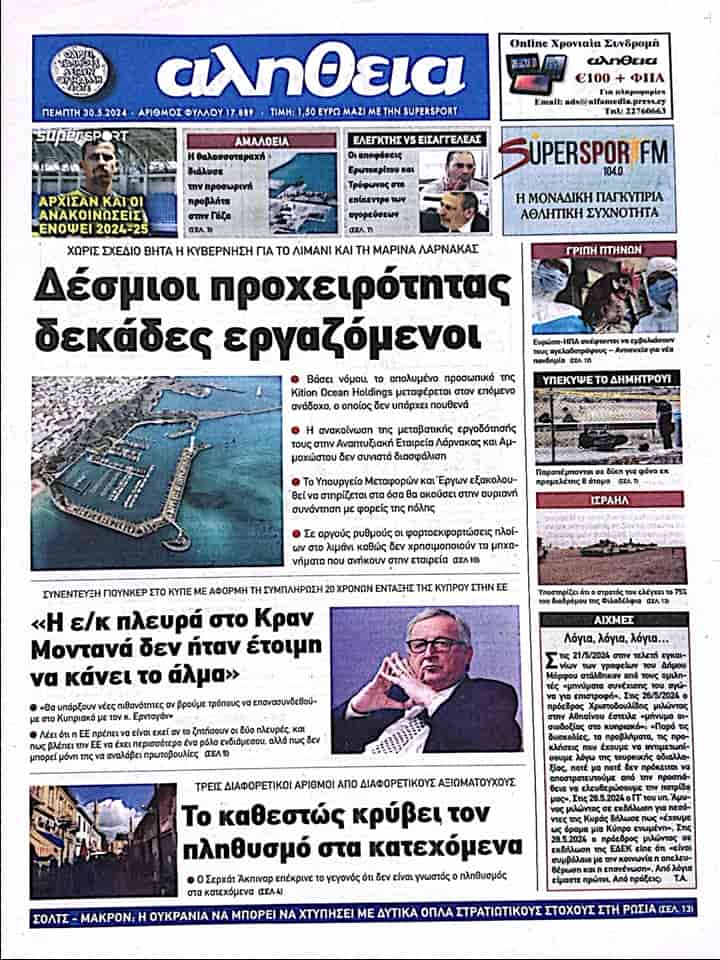 ALİTHİYA “Onlarca çalışan özensizlikten mahsur kaldı” başlığını kullandığı manşet haberinde Larnaka limanı ve marinası için Rum hükümetinin bir B planının olmadığına değiniyor.
