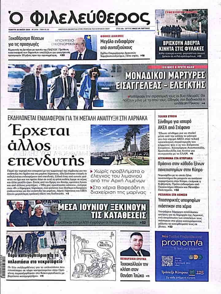 FİLELEFTEROS manşetten paylaştığı haberinde “Başka yatırımcı geliyor” başlığını kullanarak Larnaka’daki önemli gelişime ilginin arttığına, Larnaka Limanı’nın idaresinin sorunsuz bir şekilde Rum Limanlar İdaresi tarafından gerçekleştirildiğine ve marinanın yönetiminin Rum Ulaştırma Bakanı Aleksis Vafeadis’in elinde olduğuna değiniyor.