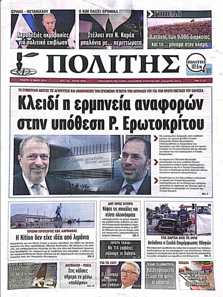 POLİTİS “Rikkos Erotokritos davasında önemli olan raporların yorumlanmasıdır” başlığı ile aktardığı manşet haberinde Konsey’in satın alımları duyduğuna ve Rum Sayıştay Başakanı Odisseas Mihailidis’in ilk itirazına ilişkin kararını önümüzdeki Çarşamba günü duyuracağına değiniyor.
