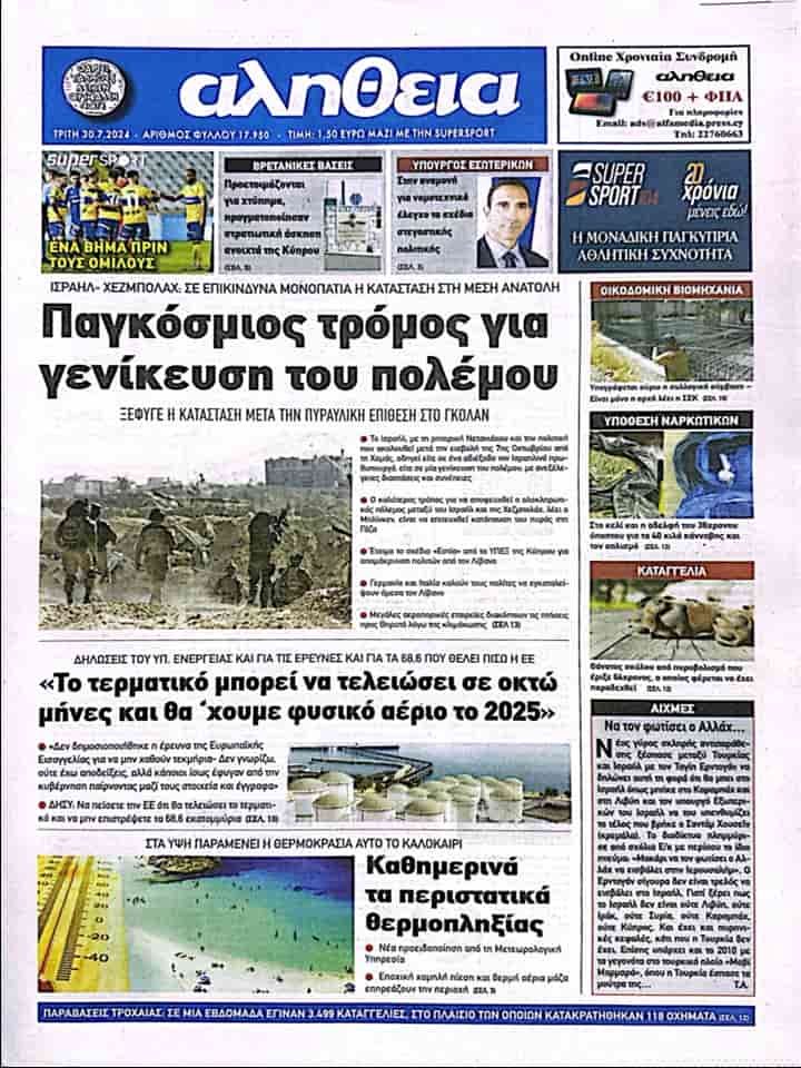 Gazete sürmanşet haberinde ise kısaca İsrail ve Lübnan arasındaki savaş dolayısıyla, tüm bölgenin, trajik sonuçlara neden olabilecek yeni saldırılardan korktuğunu ve Kıbrıslı Rum yetkililerin, Lübnan’daki Kıbrıslı Rumların oradan uzaklaştırılmasına yönelik planı devreye sokmaya hazır olduğunu aktarıyor.